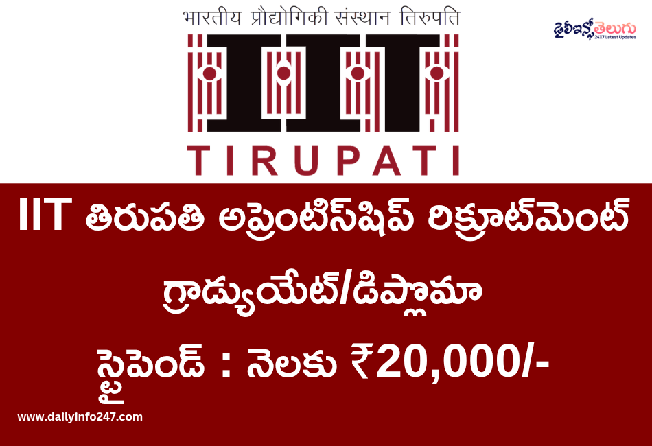 IIT Tirupati Apprenticeship Recruitment 2026: ఐఐటి తిరుపతి, నేషనల్ అప్రెంటిస్షిప్ ట్రైనింగ్ స్కీమ్ (NATS) కోసం అర్హులైన గ్రాడ్యుయేట్/డిప్లొమా అభ్యర్థుల నుండి (2022, 2023, 2024, 2025, & 2026 సంవత్సరాలలో ఉత్తీర్ణులైనవారు) దరఖాస్తులను ఆహ్వానిస్తోంది.